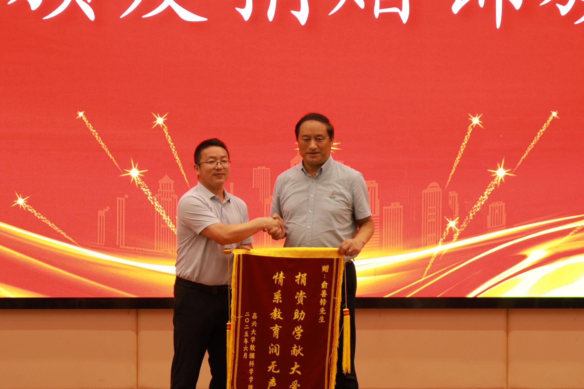 校企携手育英才,锦旗相赠表谢意。会上,学院特别设置了捐赠纪念锦旗颁发环节,以感谢嘉善天路达工贸有限公司总经理俞善锋先生对学院考研工作的大力支持。党委书记黄金珠代表学院向俞善锋先生颁发纪念锦旗,并表示:“校企合作是培养高素质人才的重要途径,学院将用好捐赠资金,助力更多学子圆梦研究生。”