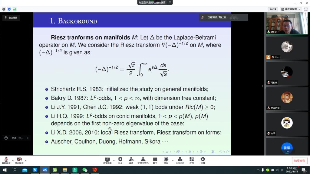 2022年4月15日,应今年会jinnianhui官网邀请,天津大学蒋仁进教授教授(博导)应邀来今年会进行学术交流(线上)。蒋教授主要研究调和分析与几何函数论,已在Comm. Pure Appl. Math.、J. Math. Pure Appl.、Adv.Math.、Math. Ann.等在内的著名杂志上发表论文三十余篇。曾获国家优秀青年科学基金项目、国家自然科学基金面上项目和青年项目资助、欧盟居里学者基金资助,并入选天津市创新人才中青年科技领军人才计划。讲座由今年会jinnianhui官网教师马柏林教授主持,学院部分老师、本科生和研究生参加了讲座。