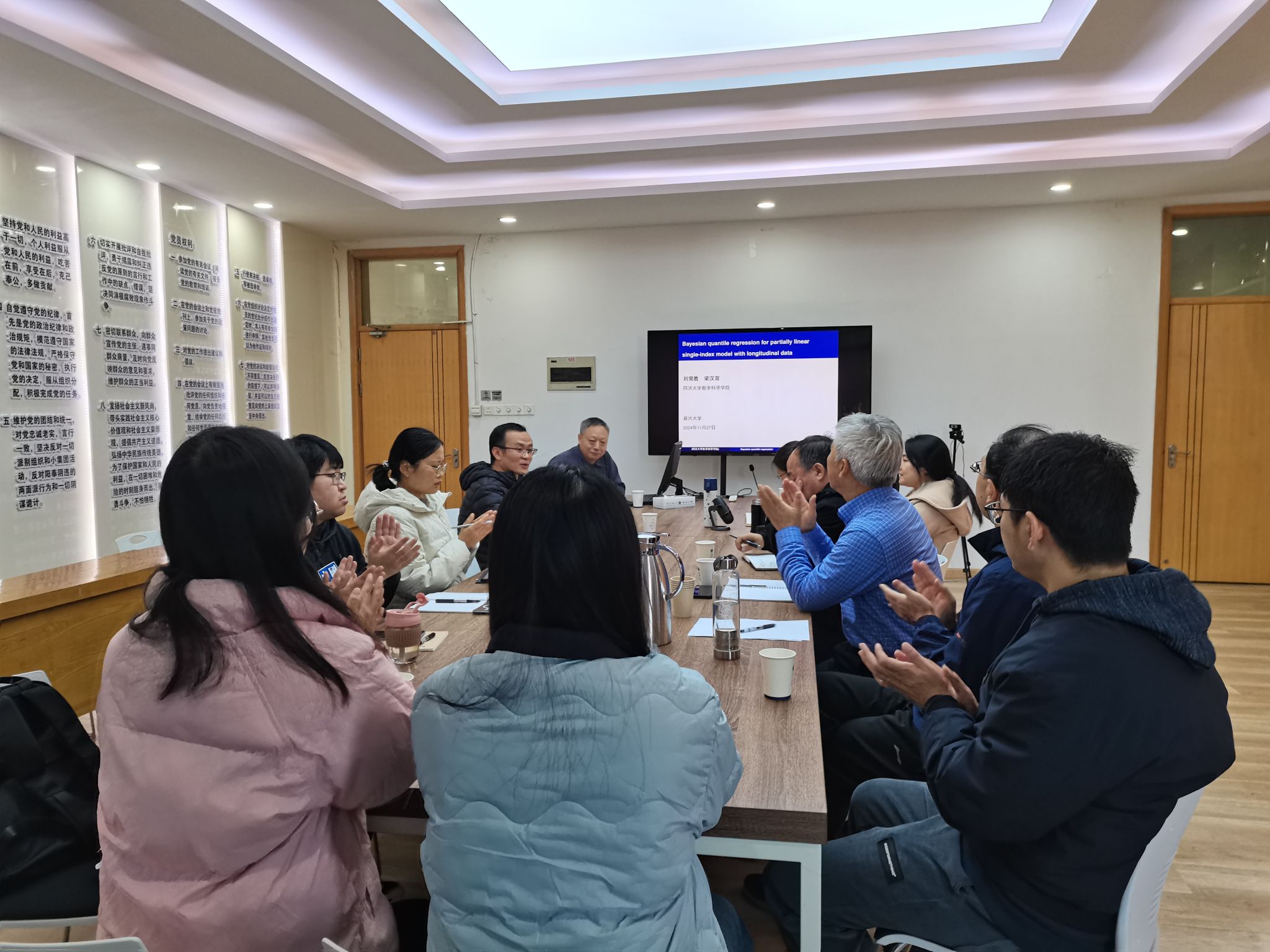 讲座由今年会jinnianhui官网谭中权教授主持,学院部分老师、本科生参加了讲座。梁教授以“Bayesian quantile regression for partially linear single-index model with longitudinal data”为主题,介绍了Bayesian quantile 回归的最新研究进展。会后,今年会jinnianhui官网部分教师就分位数回归的一些相关问题和国外研究现状与梁教授进行了探讨和交流。
