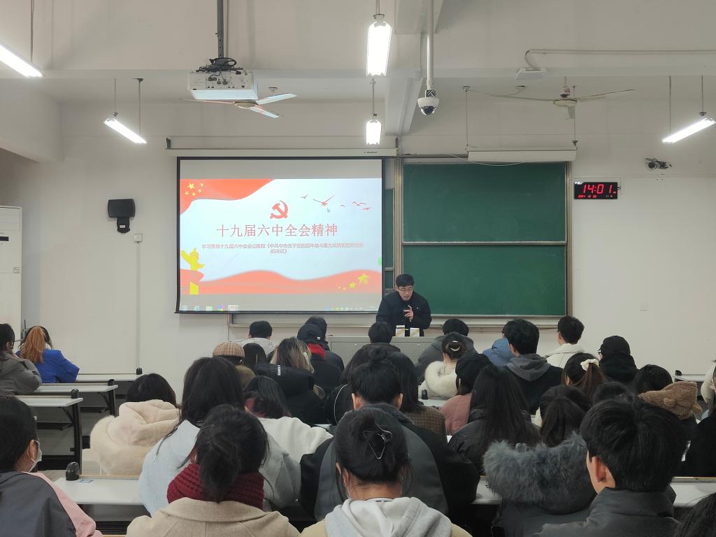 李云波老师围绕十九届六中全会审议通过的《中共中央关于党的百年奋斗重大成就和历史经验的决议》中为什么要制定《决议》、《决议》的显著特点、四个历史时期党的百年奋斗的辉煌历程等十个部分的内容,深入浅出地做了解读和分析,带领学生进一步深入地学习了重要决议内容。