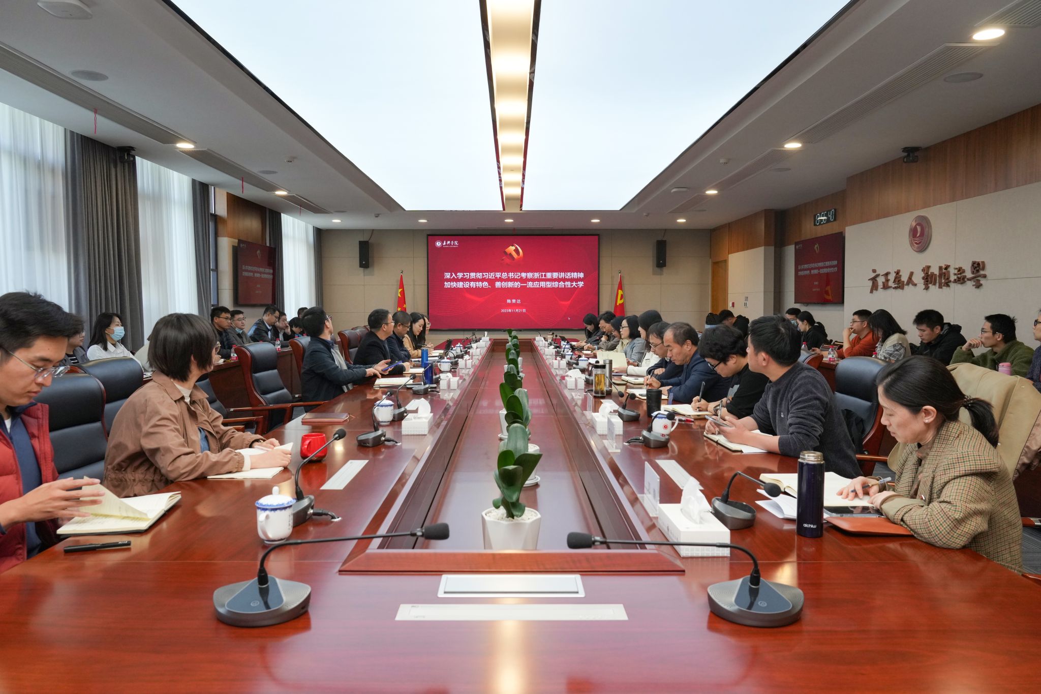 他强调,要深学细悟,坚决把思想和行动统一到贯彻落实习近平总书记重要讲话精神上来;要挚信笃行,持续兴起学习宣传贯彻习近平总书记重要讲话的热潮;要实干担当,坚持在创造性贯彻落实、创新性转化发展上下功夫、求实效;要求真务实,对标省委部署,聚焦中心工作,持续推动学校事业高质量发展。他希望二级学院加快培育建设硕士学位授权点,不断加强学科和专业建设,持续提高人才培养质量,主动融入和服务“两个先行”;希望广大教师立志做大先生,潜心做大学问,努力育大英才;希望广大学生坚定理想信念,坚持砺德砺行,练就过硬本领,始终走在前列。