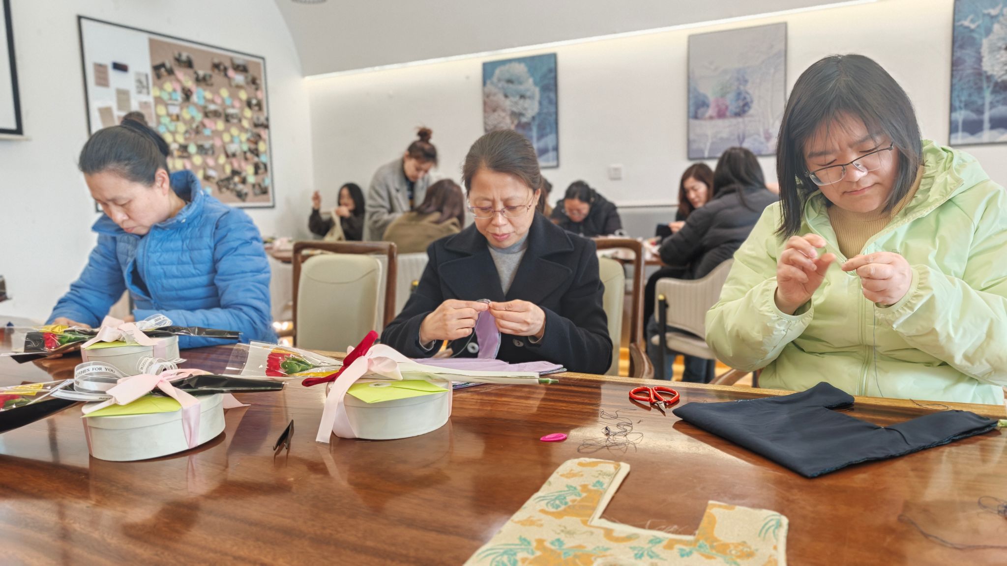 本次活动邀请了专业手工艺老师现场教学,为大家详细讲解了国风手包的制作步骤与技巧。女教职工们纷纷拿起针线、布料,精心缝制出独具东方韵味的手包,每一针一线都凝聚着大家对传统文化的热爱,活动现场充满了欢声笑语。手工活动不仅是一场技艺的体验,更是女性力量的展现,她们以巧手传承文化,以匠心雕琢生活,以协作凝聚温情,生动诠释了新时代女性“柔而不弱、美而不娇、慧而不耀”的多维风采。