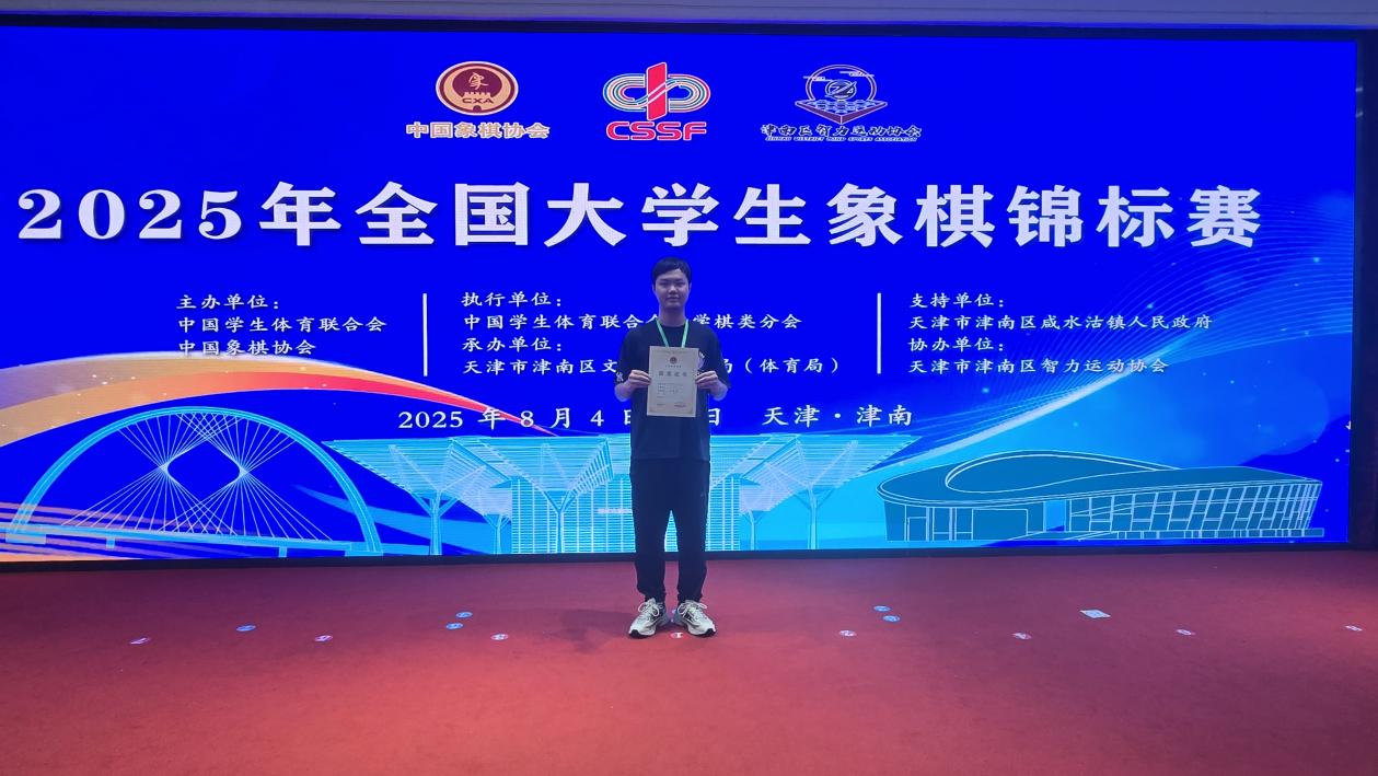 近日,在由中国学生体育联合会、中国象棋协会主办的2025年全国大学生象棋锦标赛上,今年会数学与应用数学专业221班赵嘉炜同学,在学校体育与军训部王国飞老师的指导下,与来自42所高校的百余名棋坛精英同台竞技,经过四天九轮的激烈交锋,最终取得男子组个人赛全国第四名的优异成绩,为浙江省参赛高校取得的最好成绩。